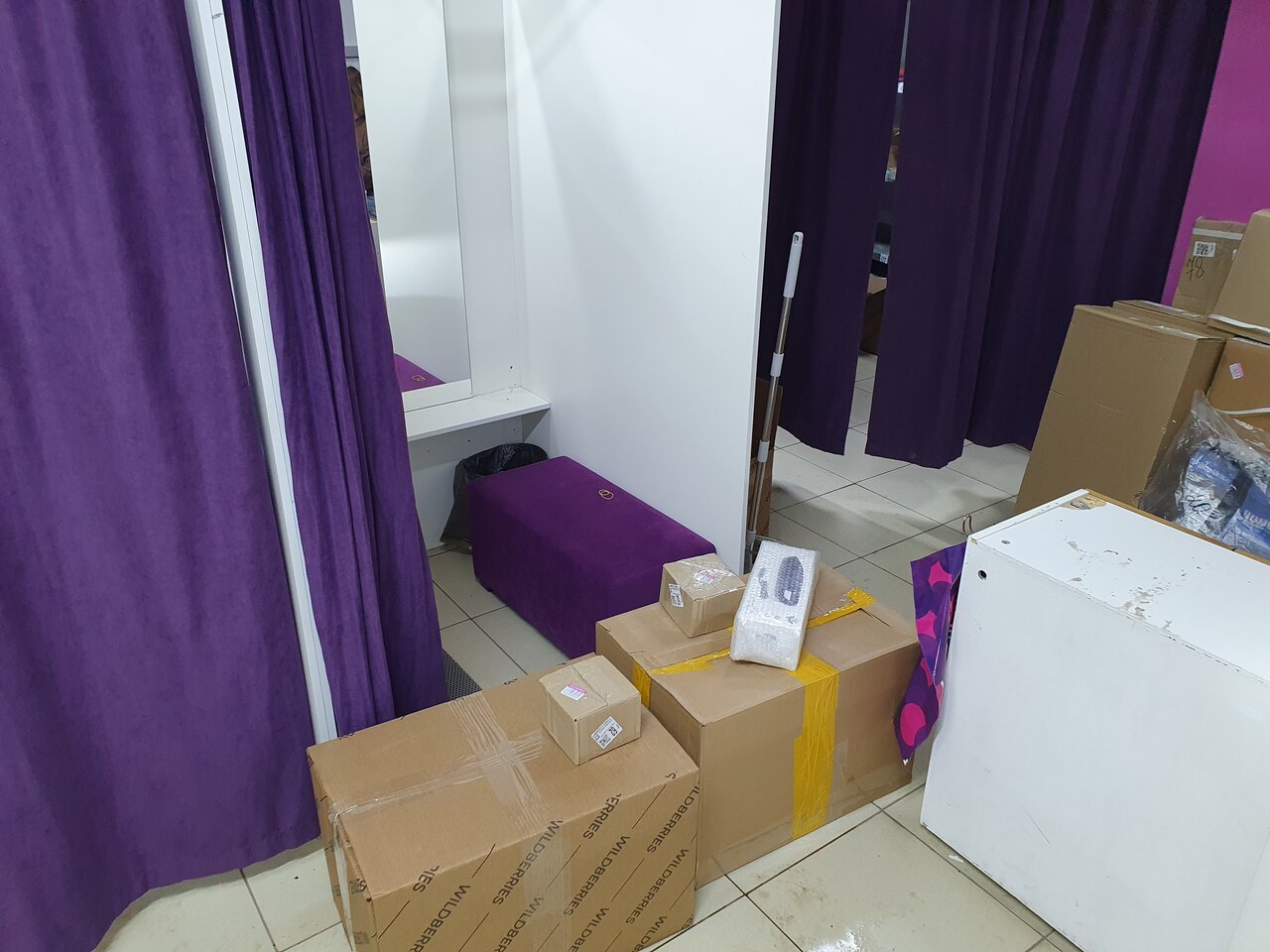 - Тесное, захламленное помещение, товары навалены в коробках