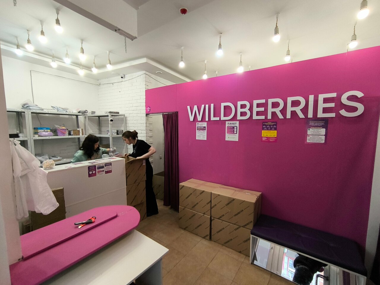 В принципе, я в нескольких точках был, везде нормальные спокойные доброжелательные продавцы. Вот и тут:) Есть пункты примерки, есть стол для раскладки товара, есть скамейка посидеть подождать. Обычный удобный пункт wb.