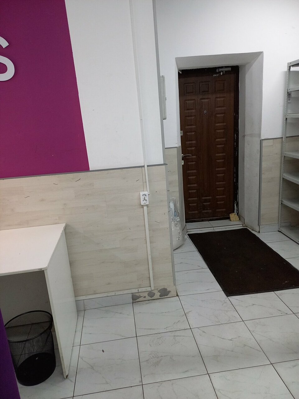 Обшарпанный вход, внутри всё раскидано. Вокруг лежат пакеты, персонал без масок.