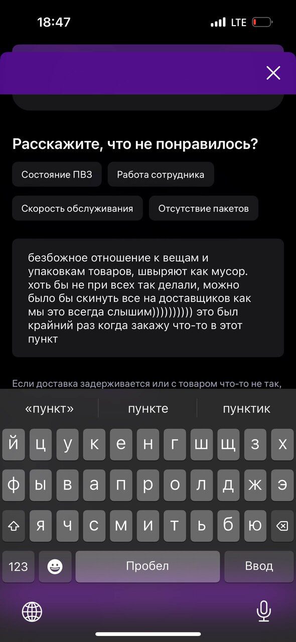 Обманывают с возвратом заказа. Дезинформировали с возвратом заказа без брака. Если Вам в этом пвз утверждают, что на товаре нет бирки, потому нужно создавать заявку на товар без брака – не совершайте мою ошибку и ни в коем случае не создавайте заявку. После этого на заявку придет отказ и никакая поддержка не поможет. Т.к. эти заявки только на брак. Повторно после обращения в пвз мне сказали писать в поддержку. В другом пвз не приняли т.к. есть отказ по заявке. Сказали что отказывать мне в возврате изначально в этом пвз не имели права. На сайте к сожалению только сейчас нашла информацию что действительно без брака обязаны принять в пвз без заявки. Теперь не могу вернуть никак и вышел срок. Будьте осторожны.